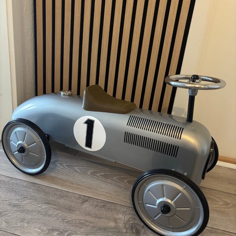 Her er den ultimative gå-racerbil, i flot sølvgrå farve, som uden tvivl vil vække jubel hos både junior og far.