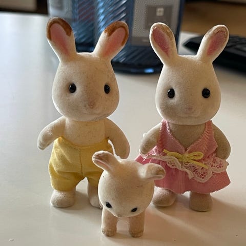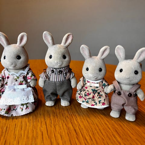 Vintage Sylvanian Families grå kanin familie fra 1990’erne. Originale figurer i pæn stand – far, mor og baby. Sjælden klassisk og først udgave