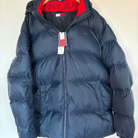 Tommy Hilfiger Jakke i blå farve, størrelse M. Jakken er designet til mænd og egner sig til udendørs brug. Den har en lynlås foran og et mønstret inderfor med Tommy Hilfiger logoer.