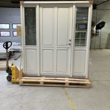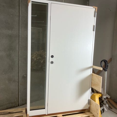 Facadedørsparti 112x208cm i alu med 2-lags thermoruder og lavt alubundstykke. Åbner venstre ud. Produceret af FP Gruppen. Der medfølger ikke en nøgle til den monterede låsecylinder. Dimension B:112 X H:208 X D:6,5cm