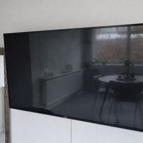Samsung UE55F8005 TV med en skærmstørrelse på 55 tommer. LED-skærm. Modelnummer UE55F8005. Typisk strømforbrug på 76W. TV'et har forskellige tilslutningsmuligheder og leveres med monteringsbeslag som vist på billederne.