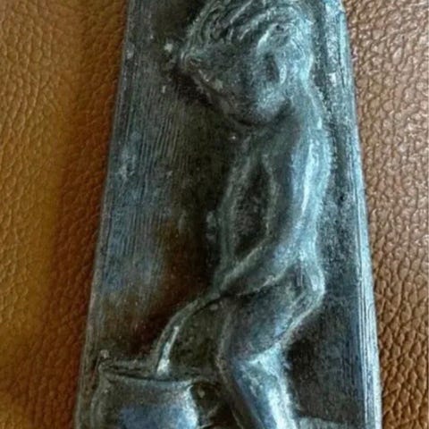 Skiltet er af bronze, men det er spraymalet, så det fremstår gråt