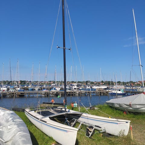 Lækker, komplet katamaran. Alt fungerer. Næsten nyt forsejl. Virkelig sjov og lynhurtig båd. Står adskilt i hoveddele i Nordsjælland