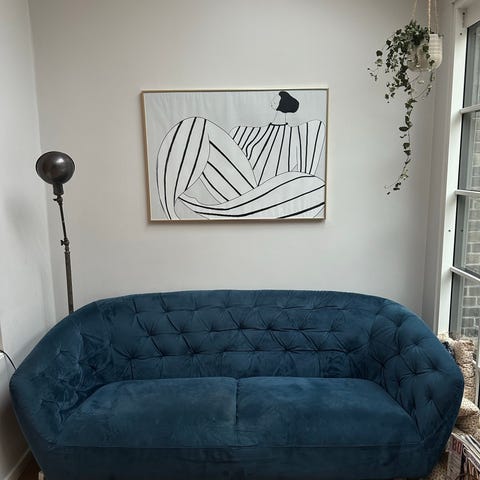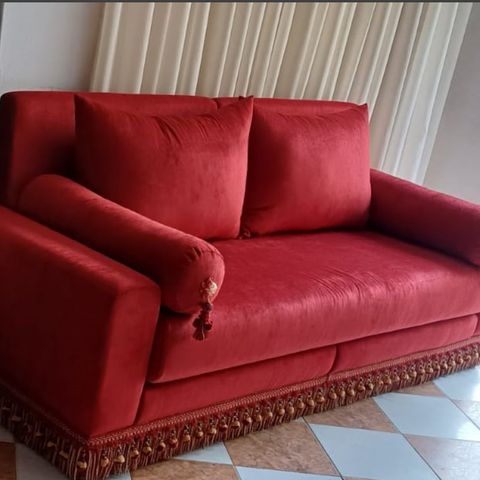 Rød 2-personers sofa i velourmateriale med polstrede armlæn og to ryghynder. Sofaen har en dekorativ kant forneden. Egnet til opholdsstue eller lignende rum.