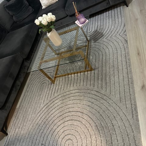 Flot vaskbart tæppe i målene 80x240 cm. Tæppen er i grå farve med fine kantdetaljer i guld og brun mønster. Den er brugt få gang og fremstår som nyt. Det er vasket for nylig, derfor er den krympet, men det retter sig ud igen efter et par dage.
