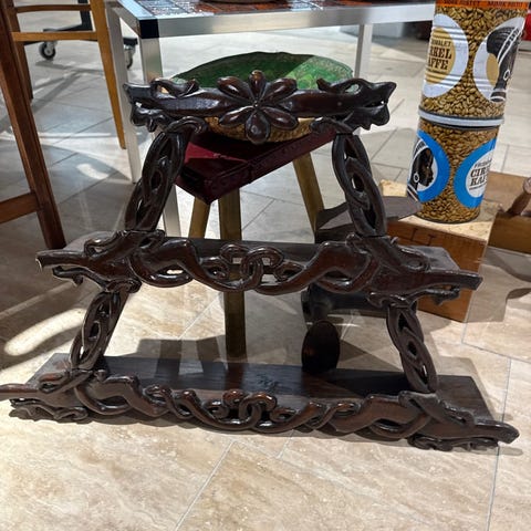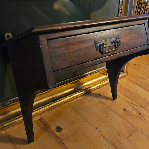Udskåret-bejdset krydsfiner, 105 år gl., Denne skønne lille ting til at hænge på væggen har flere funktioner. Der er en skuffe, med original knop man kan komme ting i. Der kan stå ting ovenpå og så er der de små fine knage man kan hænge nøgler eller andet på. Der hvor der er en mørk skjold, der har der været en nålepude af krøluld. Den er desværre gået til