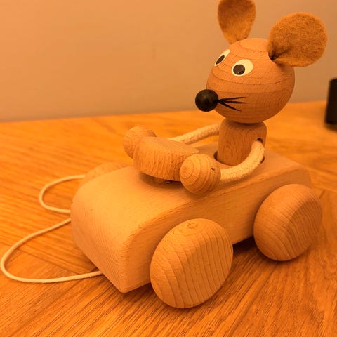 Træ legetøjs sporvogn med snor til træk. Fremstillet i naturligt træ med hjul og tag. Designet til