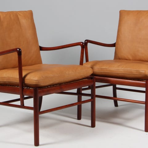 Colonial Chair PJ149, med stel af massivt mahogni i den originale oprindelige nuance. Her i den originale udgave fra P. Jeppesens Møbelfabrik. Sæde med sjeneflet og løse hynder med orange-meleret stof. Møblet er designet i 1959, og er fremstillet hos P. Jeppesens Møbelfabrik. Lænestolen fremstår flot, med lettere patina og brugsspor. Sædehøjde ca. 41 cm. Se mere i forretningen og på hjemmesiden.