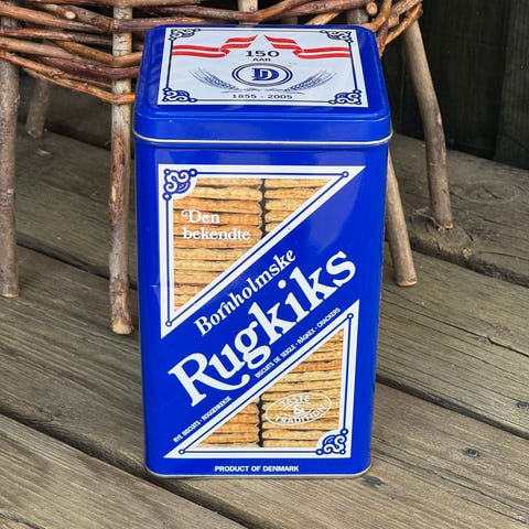 Fin blå firkantet dåse der har indeholdt bornholmske rugkiks.