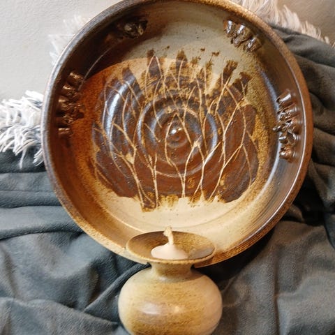 Jette Hellerøe fra Axella Retro keramik bordlampe med rund form og dekorative glassten i flere farver. Lampen har en beige og brun farvetone med sorte detaljer og en tekstureret overflade. Den er udstyret med en lille lampehoved og en ledning til tilslutning.