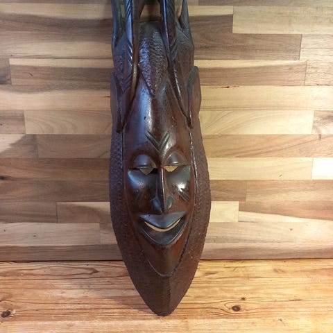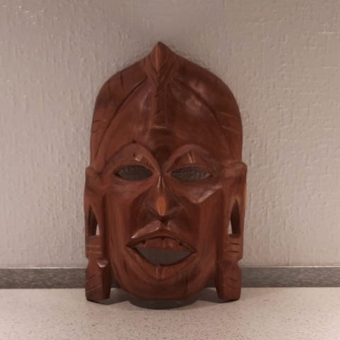 Afrikansk træmaske med detaljer i sort, rød og blå farve. Masken er monteret på en sort base, hvilket gør den velegnet til dekorativ brug. Materialet er træ, og designet afspejler traditionel afrikansk kunsthåndværk.
