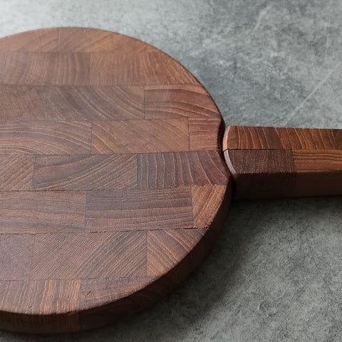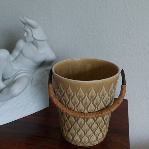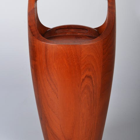 Quistgaard isspand i teaktræ med låg og håndtag. Isspanden har en rund form med en indvendig rød isolering. Velegnet til opbevaring af isterninger ved servering.