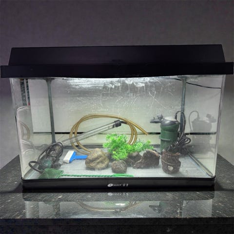 Akvarie med fisk og masser udstyr støvsuger automatisk foddermaskine og meget mere