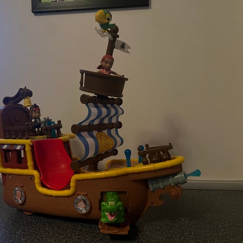 Jake og ønskeøens pirater legetøj i grå, gul og brun farve. Inkluderer en blækspruttefigur og to blå tilbehørsdele. Undervandsskib har et åbent design med plads til figurer og tilbehør. Egnet til børns leg og fantasifulde aktiviteter.
