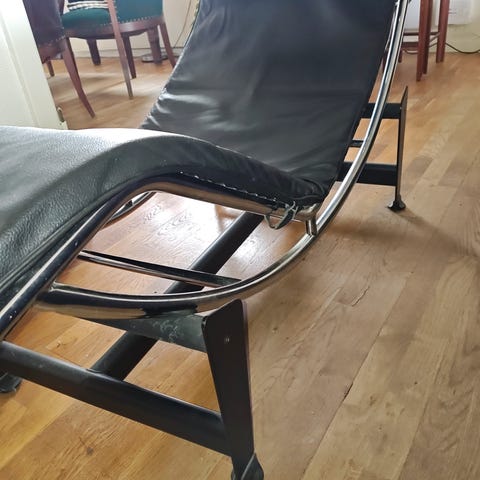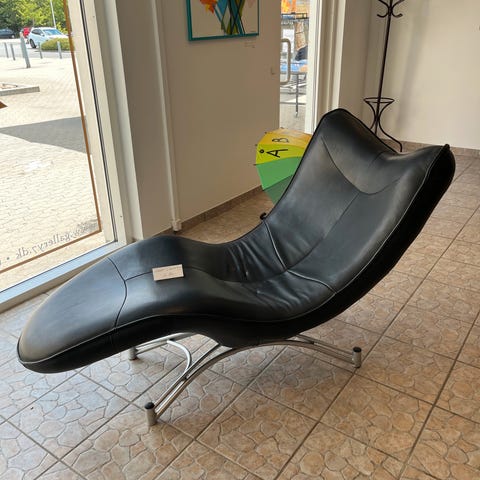 Gammel chaiselong. Fremstår med store brugsspor på læder. Prisen er 2500,-