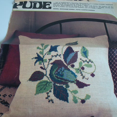 Broderet billede i ramme med antirefleks glas. Motiv af to fugle på en gren med røde blomster.