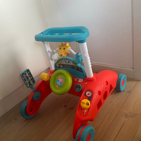 Fisher-Price gåvogn med integreret aktivitetscenter, designet til børn. Gåvognen har et farverigt design med rød, gul, blå og grøn farve og inkluderer forskellige interaktive elementer som knapper, tandhjul og musikalske tangenter. Materialet er primært plastik. Egnet til små børn som støtte til at lære at gå og stimulere sanserne gennem leg.