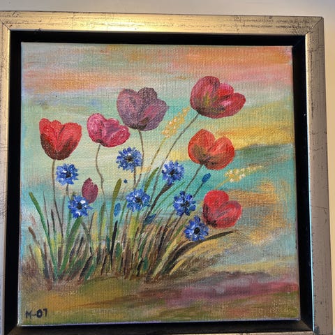 Blomstermaleri af SK med farverig blomsterillustration på baggrund i varme toner. Maleriet er indrammet i en lys træramme og egner sig til vægophæng som dekorativt element mål 24,5 cm x 19,5 cm, sender gerne.