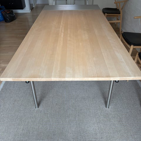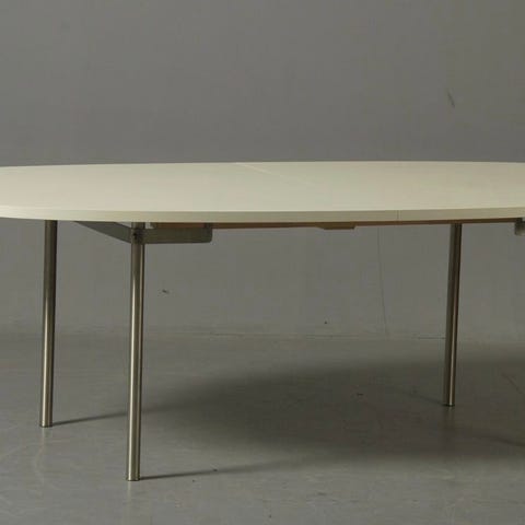 Hans J Wegner spisebord med hvid laminat bordplade og børstet stålben. Der følger 2 udtræksplader med 60x120 cm (totalmål 240 cm)