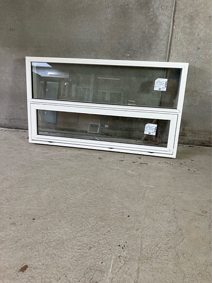 Vinduesparti med 2 faste felter i hvid malet træ. Lille revne i indvendig samling.