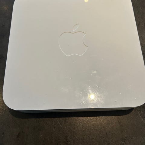 Apple Airport Express Router i hvid farve. Enheden har en integreret strømadapter med europæisk stik, en Ethernet-port, en USB-port og en lydudgang. Designet til trådløs netværksforbindelse og kan anvendes til at udvide Wi-Fi dækning eller til trådløs streaming af lyd.