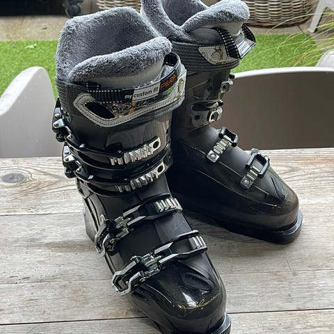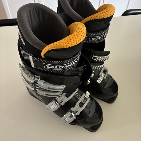 Salomon skistøvler i sort/hvid med fire individuelle spænder. Str. 26 (svarer til ca. str 41)