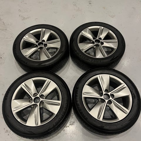 Toyota fælge 17" 5*100 m. helårsdæk. De har M+S mærkning, og snefnug symbolet, altså lovlige at køre med i hele året i Danmark. To af dem har 6 mm mønster tilbage, så godt med mønster. De to andre er der meget lidt mønster tilbage.