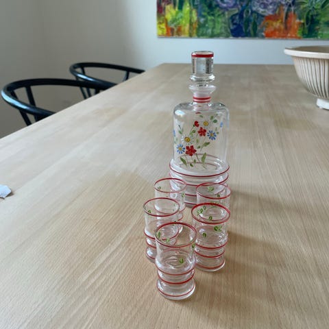 Flasken har en klassisk form med en lang hals og er fremstillet af glas. Egnet til opbevaring af drikkevarer eller som dekorativ genstand.