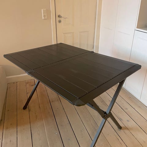 Foldbar campingbord med bordplade i lyst træ og metalramme. Bordet kan foldes sammen for nem transport og opbevaring. Medfølger 4 foldestole med rødt stof og sort metalstel. Sættet er velegnet til udendørs brug som camping eller picnic.