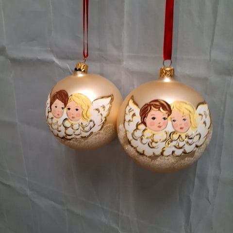 Det er en gennemsigtig glaskugle med et stjernemotiv af ældre dato Den har en metalophæng.