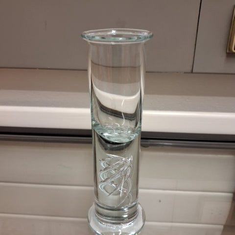 Glaset er høj og slank, fremstillet af klart glas med en glat overflade. Den har en cirkulær base og en elegant form.