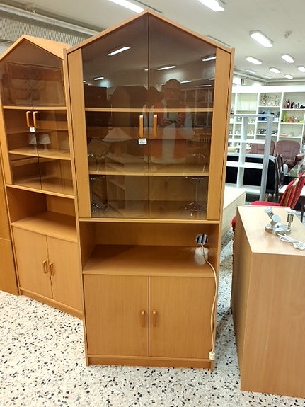 Møblet har en enkel design med to låger nedenfor og et åbent rum ovenfor. Det er lavet af træimiterende materiale. Lågerne har gyldne håndtag. Lys træfarve.,Afhentes i:,Røde Kors Aalborg (851),Bemærk at mail, chat og beskeder ikke besvares, og varen skal købes på knappen "Gå til varen"