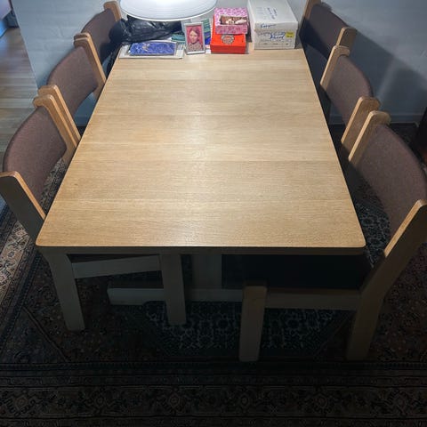 Klassisk dansk spisebord i massiv eg med 6 matchende stole, udført i lyst træ. Stolene har grøn og stribet stofpolstring i uldstof originalt med dekorative sømdetaljer. Bordet har en oval form med udskårne ben og kan udvides med tillægsplader. Møblet er egnet til spisestuebrug og har et 1970 klassisk dansk design.