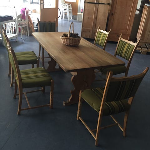 Spisebord med 6 stole i eg med grøn og stribet original uld polstring 1970erne.