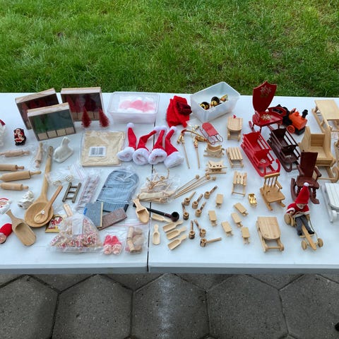 Til en hygge aften, tingene er løsdele, bla 4 små nissehuer, nogle hoveder og halstørklæder til nogle større dukker. det meste er som nyt, dog er pappet til sprællemand og kravlenisser lettere bukket. men til en god hyggestund med de små.