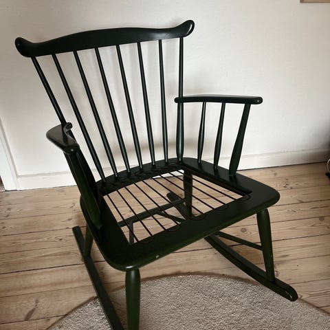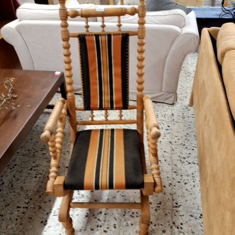 Gyngestol/præstestol massiv egetræ med Rødt stribet uldstof med messingnitter originalt med matchende fodskammel 1970erne. God stand.