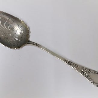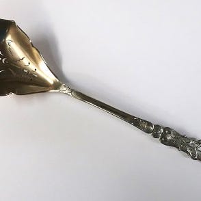 Sølvske, jordbærske, serveringsske, hulske, Sølv tretårnet, 175 år gl., Gammel dansk empire jordbærske fra sølvsmed Samuel Jacob Nicolai Prahl, født år 1800, Borgerskab 1825. Stemplet fra 1839. Tretårnet. L: 32,5 cm.Forgyldt. Yderste velholdt. Kan sendes overalt.