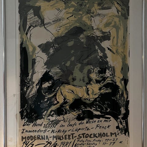 Plakat med to italienske klovne fra cirkus. Gætter på den er fra 50’erne eller der omkring. Ved ikke noget om den. Kan ikke se om den er malet , men syntes at kunne mærke overgange. Har en lille skade i hjørnet. Den ser ud til at være gammel. Den er limet fast pa pappet og der følger papramme og metalramme med, uden glas. Jeg har haft den med til brun Rasmussen , der sagde de at det var lavet af Erik Stockmarr. Byd gerne.