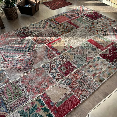 Design House Stockholm Patchwork Tæppe i rød og sort farve med mønstre i blå og beige nuancer. Tæppet har et patchwork-design med forskellige geometriske og blomsterinspirerede motiver. Materialet er tekstil, og tæppet er velegnet til brug som gulvbelægning i hjemmet.