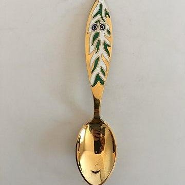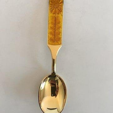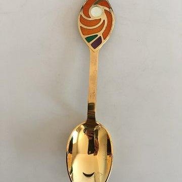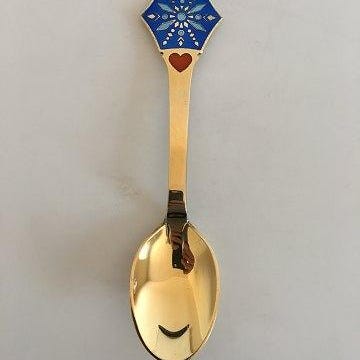 Anton Michelsen Forgyldt Sterling Sølv Juleske 1989. Design: Hans Voigt Steffensen, f. 1941, dansk maler; autodidakt. Efter ungdommens eksperimenter med bl.a. fotocollager fandt Voigt Steffensen i slutningen af 1970'erne sit personlige udtryk i form af enkle figurtegninger af folkeliv, optræden, fx dans, og landskaber. Værkerne er udført i en pågående og farveglad kolorit, der synes i slægt med de franske fauvisters. Ud over maleri har han arbejdet med farvesætning af skoler og andre institutioner. Denne vare kan afhentes i følgende butik: Store Kongensgade 76