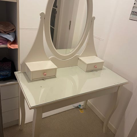 Ikea Hemnes sminkebord. Spejl og øverste skuffer kan tages af så det bliver til skrivebord. Nogle ridser og små afskalninger i lakken. Køber skal kunne afhente.