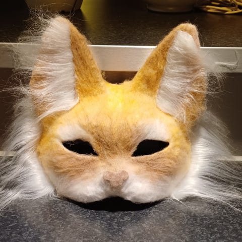 Therian maske fremstillet i filtmateriale med detaljer som hvide hår og en grønt blad. Masken har udskæringer til øjnene og elastik til fastgørelse bag hovedet. Velegnet til kostumer og udklædning.