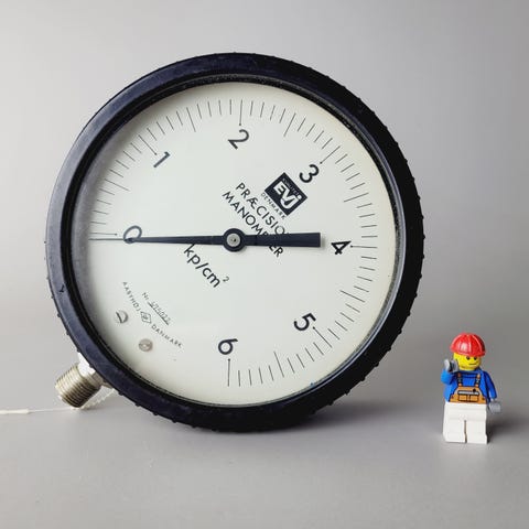 Sælger dette ældre præcisionsmanometer i metalhus fra Aabyhøj, Danmark. Måleren har tjent som ARBEJDSNORMAL, hvilket betyder, at den har været anvendt som referenceinstrument, og derfor er af høj præcision.