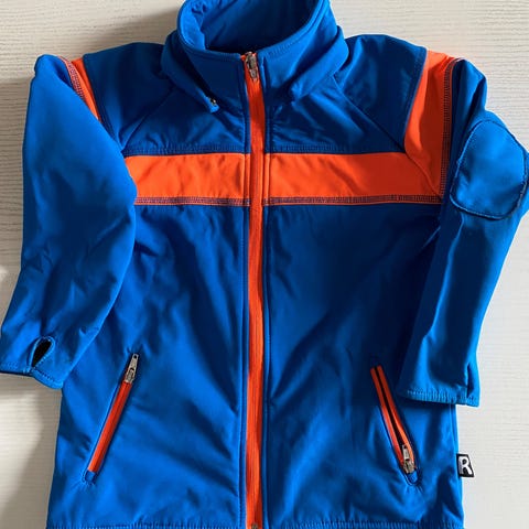 1 stk. trøje, armyfarvet med mørkblå ærmer og turkisfarvet hætte foret med army farvet stof som trøjen. Har turkisfarvet mønster på ryggen.