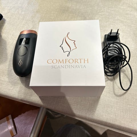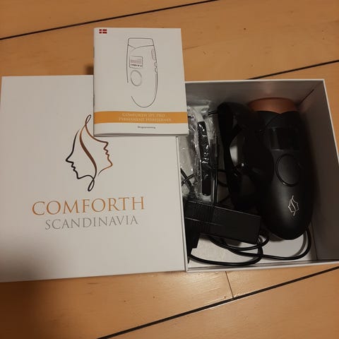 Comforth Scandinavia IPL hårfjerningsenhed i sort farve. Enheden har 2 strømadapter og kabler til brug. Designet til hårfjerning ved hjælp af IPL-teknologi. Kompakt og bærbar model.