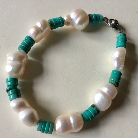 Flot nyt armbånd med smukke blå ferskvandsperler og guld seedbead perler.