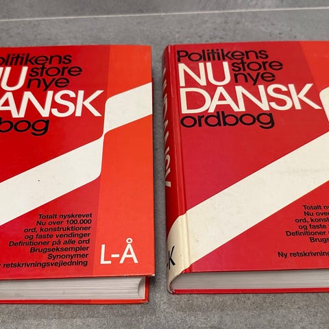 Politikens Nudansk Ordbog Ordbog Sæt bestående af tre bind med rødt hardcover. Inkluderer ordbøger med alfabetiske opdelinger A-K, L-Å og en slangordbog. Dansk sprogindhold, velegnet til reference og sprogstudier.