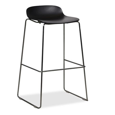 Let barstol fra DUBA B8, model Molo. Stolens sæde er udført i hvid plast og stellet står i krom.