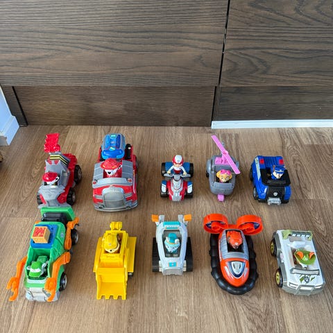 Paw Patrol legetøjsfigurer og køretøjer til børn inkluderer forskellige karakterer med tilhørende køretøjer som brandbil og gravemaskine. Varen er i god stand.