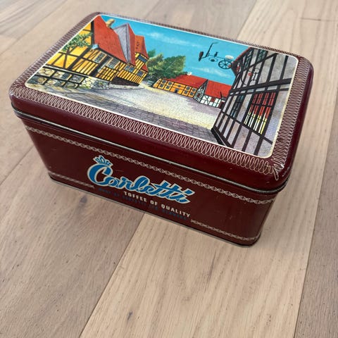 Andet, Dåse, Carletti, Stor gammel Carletti Toffee of quality dåse fremstillet af Glud og Marstrand. Dåsen har tidsrelaterede brugsspor. Mål: 29x18x11 cm.